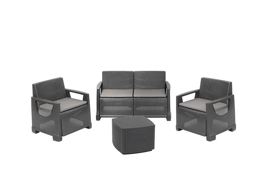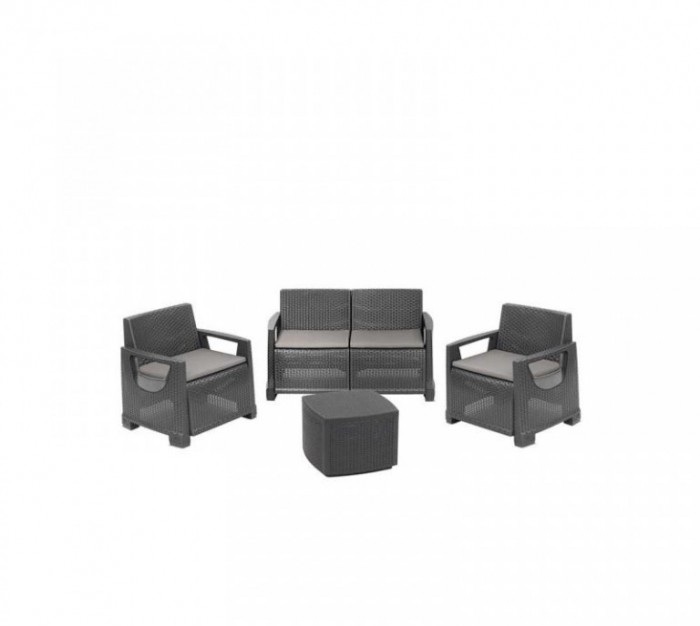 • Četvorodelni plastični set, dve stolice, sofa, sto, ratan stil, sa četiri jastuka, udoban, prijatan za sedenje, ergonomski naslon