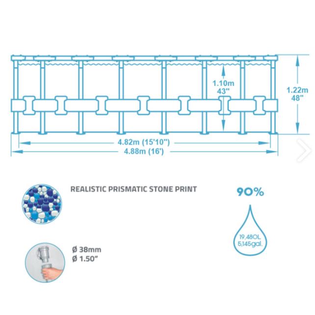 - Kapacitet bazena (90%): 19480L (5145gal)