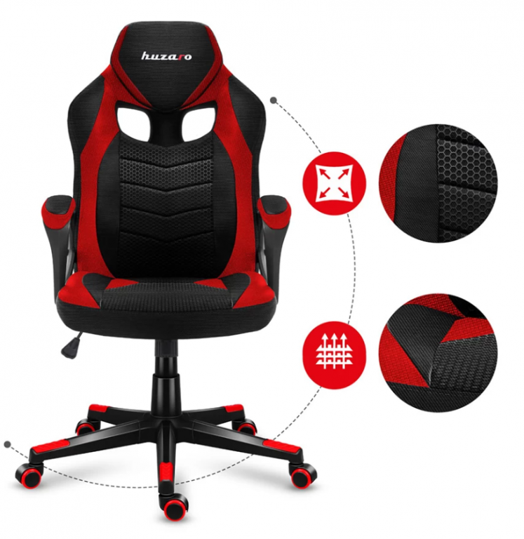 - Gaming stolica Huzaro Force 2.5 u Crvenoj boji od tekstilne prozracne mrežice. Dizajn stolice je da imitira sedišta sportskih automobila i naslon obezbeđuje pravilno držanje leđa tokom sedenja. Materijal otporan na habanje i oštećenja. Podešavanje visine i tilt funkcija za naslon i točkići od gume neće oštetiti vaš pod.