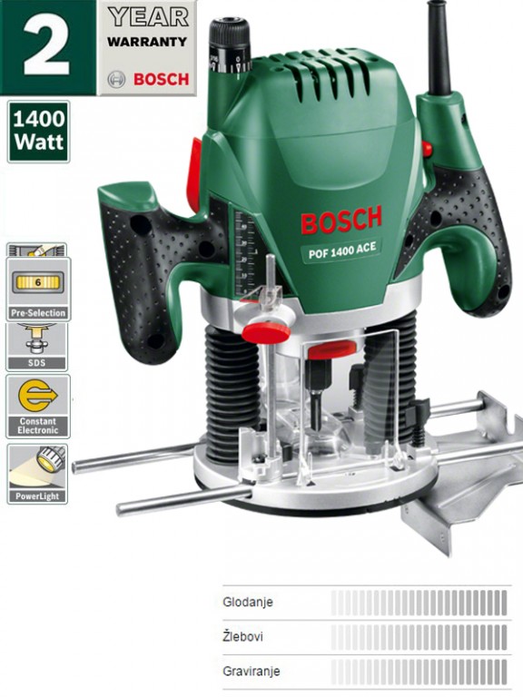 Idealna glodalica za kućne majstore koji žele da sami oblikuju drvo. Možete raditi žlebove, ivične profile ili posebno oblikovane delove. Motor od 1.400 W i fino podešavanje dubine glodanja i konstantna elektronika, omogućavaju čak i zahtevne radove glodanja. Bezbednosna oprema glodalice za drvo i velika udobnost korišćenja omogućavaju opušteno držanje pri radu, čak i kod intenzivnog rada. Ugrađena radna lampa omogućava veliku osvetljenost radnih predmeta. Bosch sistem SDS omogućava jednostavno umetanje kopirne čaure bez upotrebe alata. Priključak za usisivač za rad bez prašine. Fino podešavanje dubine glodanja idealno je za zahtevne radove uz tačnost od 1/10 mm. Jednostavna i brza promena glodala zahvaljujući integrisanoj blokadi vretena.