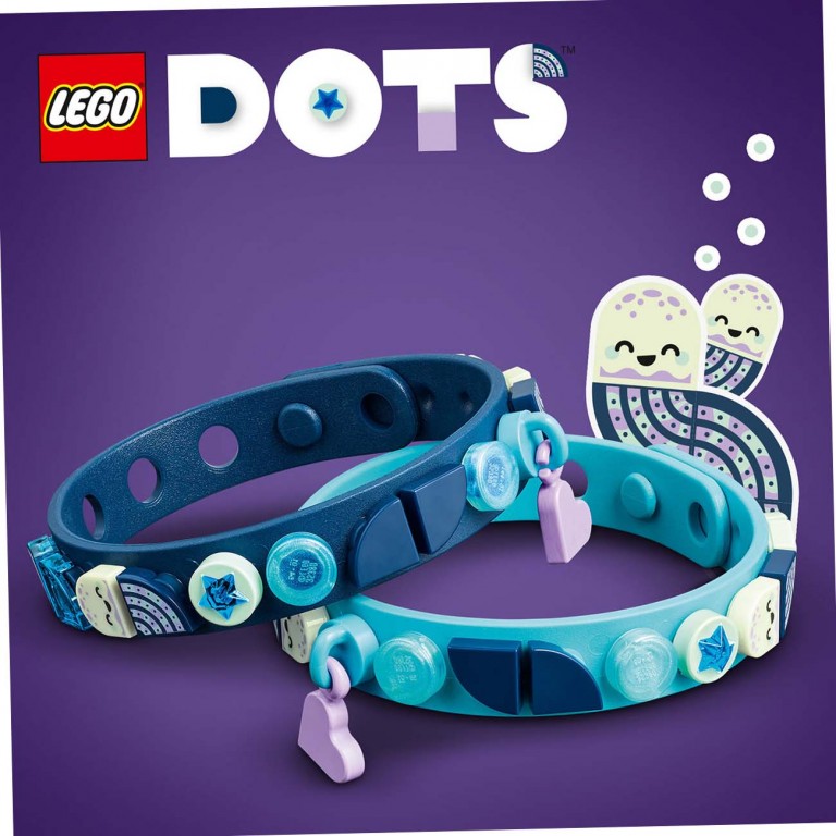 Osmisli, podeli, ponovi! Položi 2 tanke LEGO® DOTS Into the Deep narukvice na ravnu površinu i napravi dizajne sa tematikom podvodnog sveta sa pločicama u boji. Dodaj pločice čija se boja preliva, položi pločice sa meduzom koje svetle u mraku, a zatim priključi sjajnu bazu amajlija i ljubičastu amajliju u obliku srca da pokažeš svoj stil. Da li si spremna za promenu? Transformiši narukvicu u skladu sa raspoloženjem, podeli je ili se menjaj sa porodicom ili prijateljima!