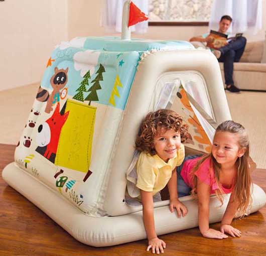 Zabavan za igru šator na naduvavanje sa zanimljivim aplikacijama. Namenjen za igru u kući. Vrata sa obe strane u vidu prozirne mreže