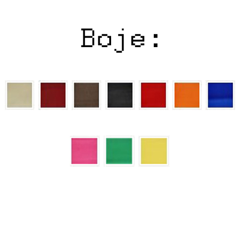 - Izbor više boja: bež, bordo, braon, crna, crvena, narandžasta, plava, roze, zelena, žuta